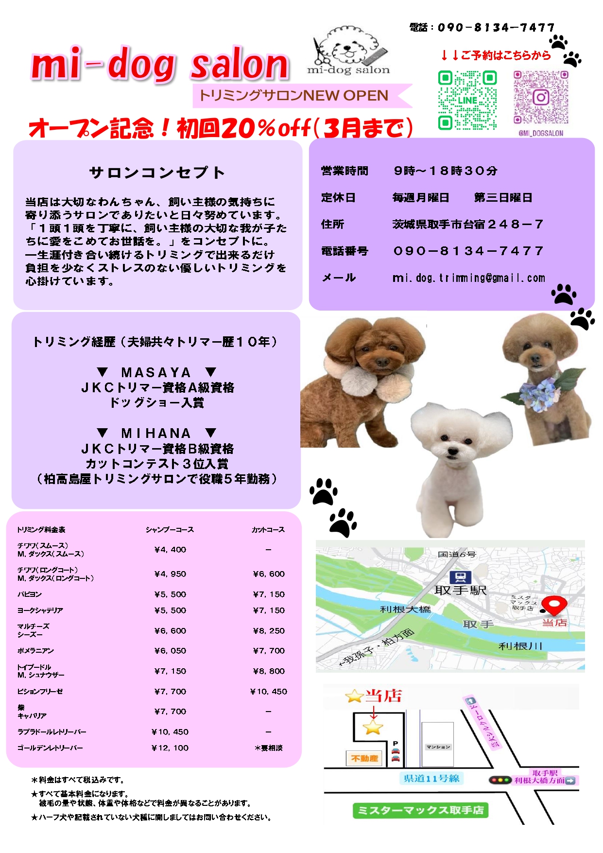 タグ: 取手市, ポスティング 取手市, ポスティング 印刷 取手市, ポスティング業者 取手市, チラシ配り 取手市, チラシ印刷 取手市, チラシデザイン業者 取手市, 集客チラシ, 特典 取手市, 特典, トリミングサロン, トリミングサロン 取手市, トリミングサロン 集客, トリミングサロン 広告, トリミングサロン チラシ, mi-dog salon, 茨城県取手市台宿248-7