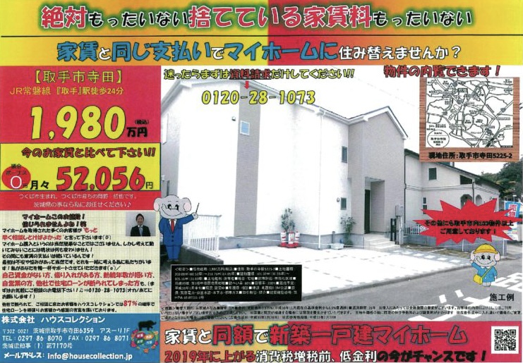 タグ: 取手市, 集合住宅限定配布, ポスティング 取手市, ポスティング 印刷 取手市, ポスティング業者 取手市, チラシ配り 取手市, チラシ印刷 取手市, チラシデザイン業者 取手市, 集客チラシ, A4印刷, カラー印刷, 建売住宅, 建売住宅 集客, 建売住宅 広告, 建売住宅 チラシ, 建売住宅 取手市, 株式会社ハウスコレクション, 茨城県取手市寺田6359アズーリ1F, 0297868070